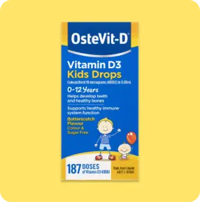 OsteVit-D Vitamin D3 Kids Drops contains vitamin D3 400 IU per 0.08mL (2 drops), to help develop teeth and healthy bones and support healthy immune system function.